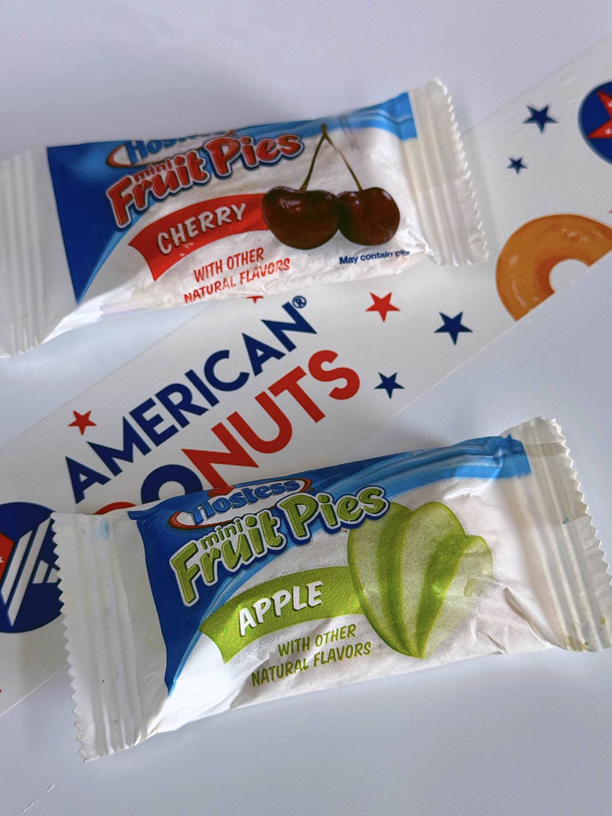 Live you Mostess with Hostess®! Hostess® Fruit Pies, the ultimate American minisnack! Freshly glazed American dough, filled with a great mixture of apple or cherry. Price per mini pie. Order a whole box by selecting ’12’ individual pies. Low-Cal! (<100!)